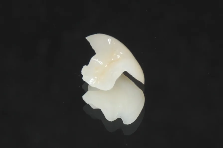これはプラスチックとセラミックを混ぜた「ハイブリッドレジン」をコンピュータで削り出したものです。