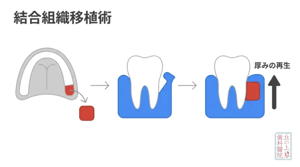 CTGを一言で説明すると、「自分のお口の中の別の場所から歯茎の中身(結合組織)を採取し、痩せてしまった部分の歯茎の内側に移植して厚みを出す手術」です。
