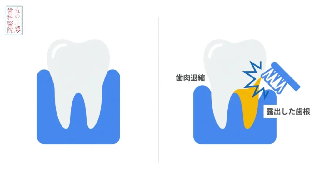 本来、歯茎の中に埋まっているはずの象牙質がむき出しになるため、冷たい水や歯ブラシの刺激が神経に直接伝わり、鋭い痛みを感じるようになります。