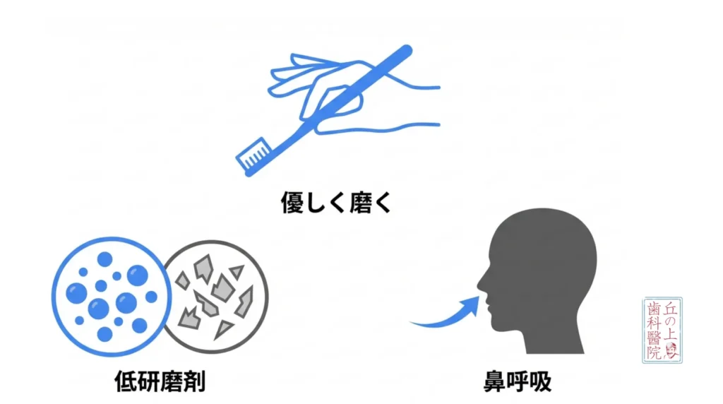「着色したくない!」「汚れを落とさなきゃ!」という焦りから、食事の直後に硬い歯ブラシで力任せにゴシゴシ磨いていませんか? 実はこれ、大きな間違いです。 ホワイトニング直後の歯は、薬剤の影響で軽度の脱灰(カルシウムが溶け出すこと)が起きており、エナメル質が一時的に柔らかくデリケートな状態になっています。ここで研磨剤入りの歯磨き粉をたっぷりつけて強く磨くと、歯の表面に目に見えない無数の「傷」がつきます。 このミクロの傷に色素が入り込むと、余計に着色が落ちにくくなり、かえって歯がくすんで見える原因になります。陶器のお皿を金たわしで洗うと、傷だらけになって茶渋がつきやすくなるのと同じ原理です。