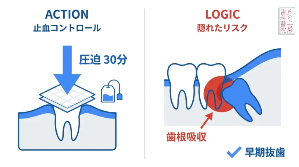 - ドライソケットの恐怖: 非常に強い痛みが1週間以上続く場合は、傷口のかさぶた(血餅)が剥がれて骨が露出するドライソケットの疑いがあります。この場合は早急に再受診が必要です。