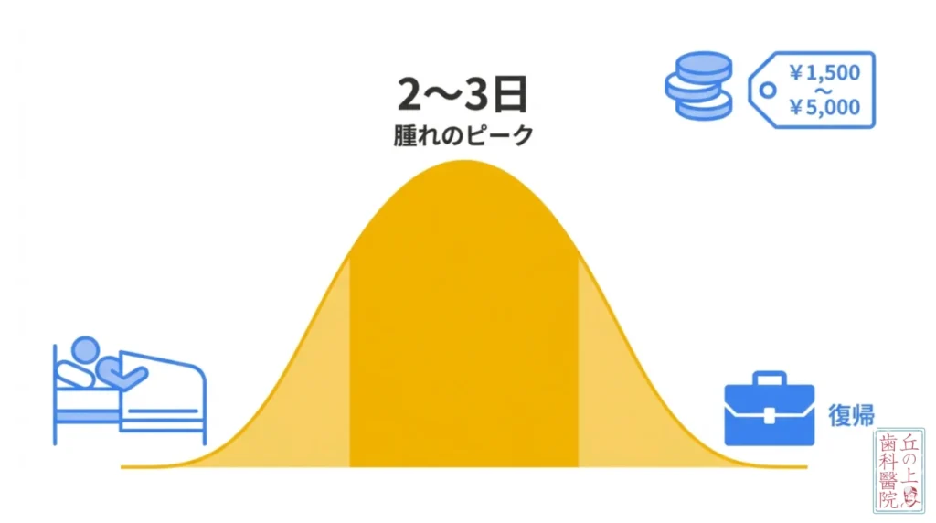A. 抜歯後2〜3日をピークに、1週間程度で徐々に引いていきます。