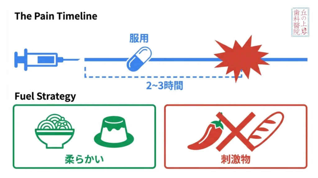- 痛みのピーク: 麻酔が切れる抜歯後2〜3時間が最も痛みを感じやすいタイミングです。そのため、「麻酔が切れる前に」痛み止めを飲むことが最も推奨するライフハックです。