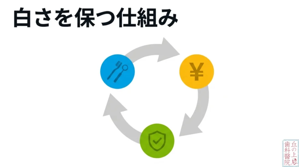 飲食や加齢によって徐々に色が戻っていきますが、適切なセルフケアと数ヶ月〜1年に一度のメンテナンス(タッチアップ)を行うことで、理想の白さを長く保つことが可能です。