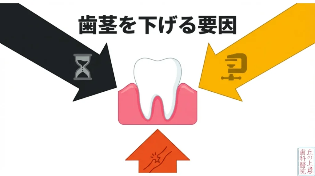 - 骨へのダメージ: 過度な力は歯を支える骨(歯槽骨)に微細なダメージを与えます。骨が溶けると、それに追随するように歯茎も位置を下げてしまいます。